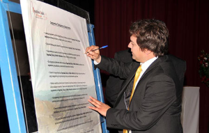 Miércoles 22 de Agosto de 2012.- Con la firma del convenio de colaboración entre Compañía Minera Barrick Zaldivar, FOSIS, la Corporación Acción Emprendedora y las Municipalidades de Tocopilla y Taltal se dará inicio a una tercera versión del Fondo de Desarrollo Productivo (FONDEPRO). Una iniciativa que fomenta el desarrollo de emprendedores y microempresarios de estas dos localidades.