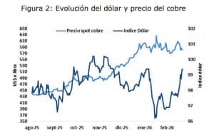 El precio del cobre cerró la semana en US$ 5,81 por libra, lo que representa una caída de 4,7% respecto al viernes anterior. No obstante, el promedio anual se ubicó en US$ 5,91 por libra, un 42,1% por sobre el promedio a la misma fecha de 2025 (US$ 4,16). La semana estuvo marcada por un shock geopolítico y un cambio hacia una postura más defensiva en los mercados globales. En el plano estructural, el escenario de oferta sigue siendo ajustado en 2026, lo que sostiene niveles elevados de precio, pero la dinámica de corto plazo estuvo dominada por el aumento del riesgo, el alza de la energía y el repliegue de posiciones en activos cíclicos.