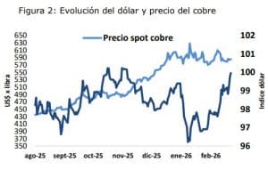 Desde fines de 2025 el precio spot del cobre subió con fuerza y se mantuvo elevado. En 2026, el spread spot–3 meses pasó mayormente a contango, señal de mayor disponibilidad inmediata y menor prima por entrega rápida, pese a repuntes puntuales.